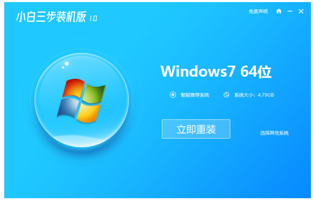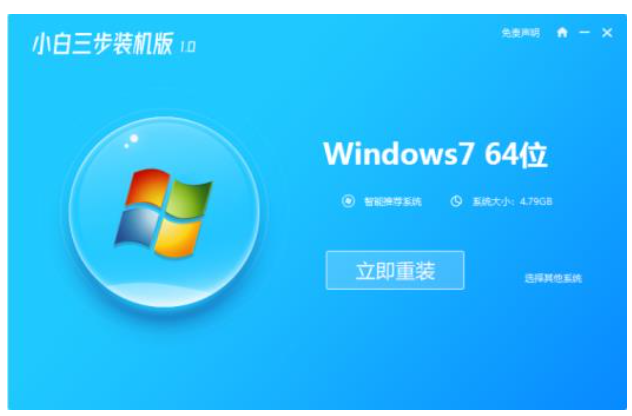 小白三步裝機版軟件中包含了WindowsXP、7、8、10系統下載,所以無須單獨去下載系統鏡像就可以直接在線重裝。使用該工具重裝系統的方式也很簡單的,并沒有復雜的操作步驟,只需要根據向導安裝即可。下面就來看看小白三步裝機安裝win7教程旗艦版64位下載安裝的教程。