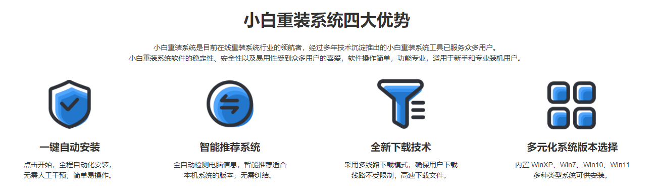 小白一鍵重裝系統2018 一鍵式自動下載安裝系統,專業客服解答確保裝機無憂 xp/win7/win8/win10多種系統選擇,滿足您的需求 提供u盤啟動盤制作工具,u盤修復工具,裝機的好幫手 支持U盤裝系統,制作1個U盤,可永久裝N臺電腦