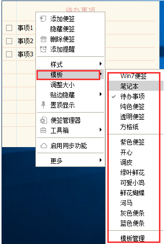 5、如果不喜歡便簽的顏色皮膚,那么可以鼠標右鍵點擊便簽,再彈出的菜單欄中點擊模板選項,在模板的右側出現多種便簽的皮膚,自行選擇體驗,挑選出合適自己的顏色以及皮膚。