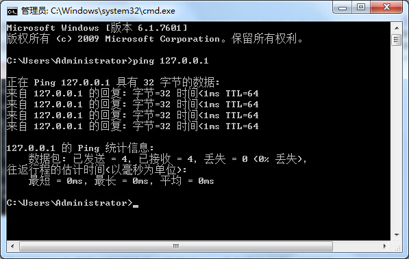 2、 接著在打開的命令提示符窗口里面輸入ping 127.0.0.1用來檢測網卡是否正常,這個為回環地址。如有下圖所示界面,則為網卡正常。