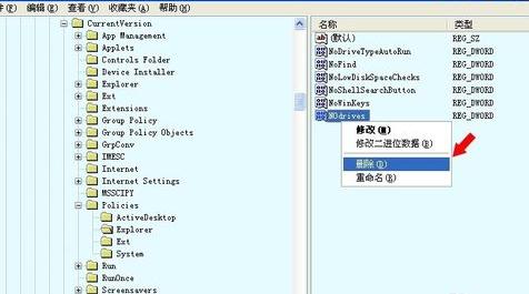 HKEY_CURRENT_USER\Software\Microsoft\Windows\CurrentVersion\Policies\Explorer分支。查看右邊的窗口是否有DWORD的鍵值NOdrives,如有將其刪除重啟電腦。