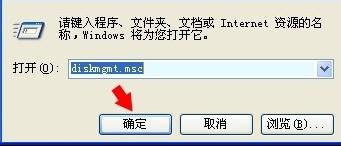2運行→輸入: diskmgmt.msc 之后點擊確定(或按回車鍵)打開磁盤管理。