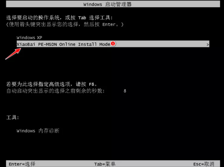 3、安裝完成后,小白軟件會提示您重啟電腦,當電腦重啟后,在開機菜單中選擇 XiaoBai PE 菜單進入 PE 系統進行安裝。