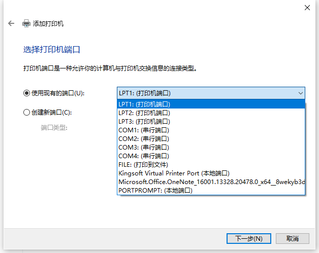 6、默認的現有端口是LPT1,可通過下拉框來選擇(若使用是USB接口的打印機,建議先連接電纜)。