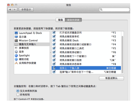 四、在打開的鍵盤設置對話框中,選擇左側的鍵盤和文本輸入,選中右側的選擇上一個輸入源,就可以對快捷鍵進行設置了~