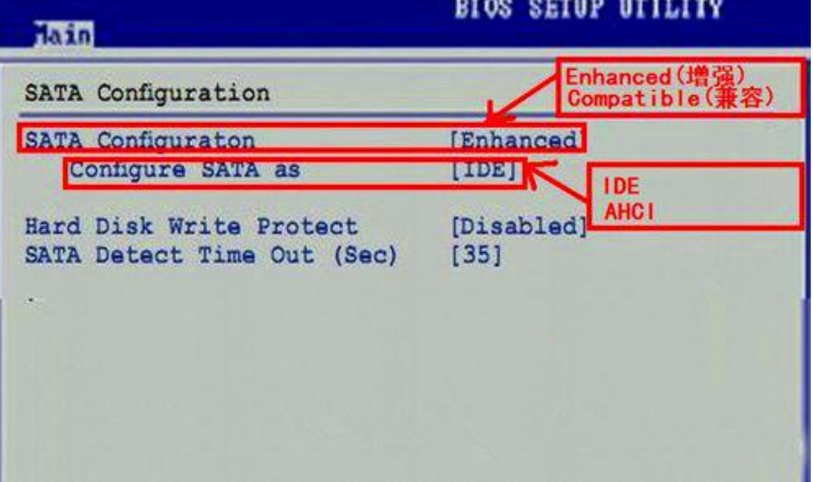 把SATA Configuration的值由Enhanced(增強型)改為Compatible(兼容型),然后再把Configuration SATA as的值,由AHCI改為IDE即可,按F10保存退出。