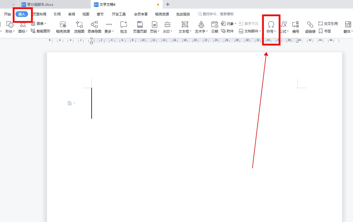 1、打開Word文檔,點擊上方插入下的“符號”。