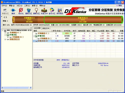 通過DiskGenius掃描,你可以清晰的看見自己的硬盤分區情況,包括分區數目(包括一般文件管理器中看不見的隱藏分區,未分配的磁盤空間等),分區的格式(FAT,NTFS等),具體每個分區所占的扇區、容量等。