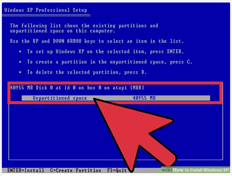 5、選擇要安裝的分區。您將看到已安裝硬盤驅動器上的可用分區列表。如果您在新硬盤上安裝 Windows XP,您應該只會看到一個標有“未分區空間”的條目。如果您的計算機上安裝了以前版本的 Windows 或 Linux,您可能會有多個分區。