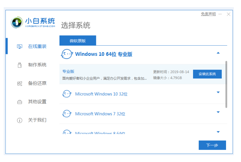 1、下載并運行小白一鍵重裝系統軟件,進入“在線重裝”中,選擇想重裝的系統。