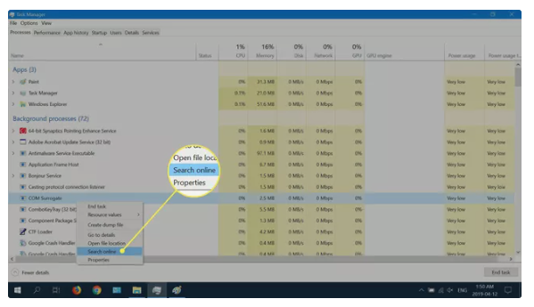 5、如果您看到正在運行的可疑進程(如占用巨大內存的進程),請右鍵單擊它并選擇在線搜索。