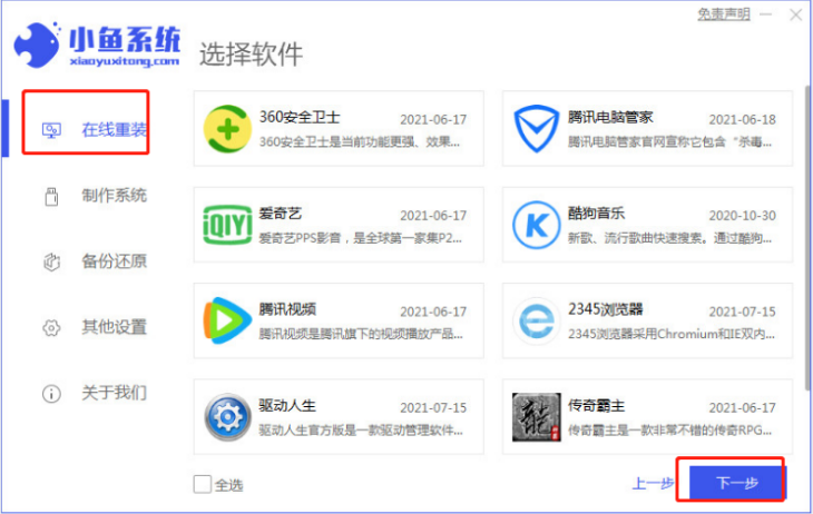 2、在“在線重裝的頁面當中”選擇我們想要安裝的軟件,點擊“下一步”。