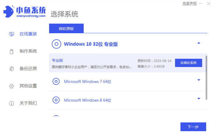 1、首先打開dell筆記本下載安裝一個小魚一鍵重裝系統工具,下載完成之后打開運行選擇win10系統,點擊“安裝此系統”點擊下一步。