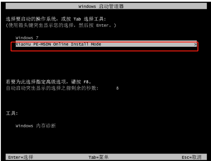 5、在電腦開機的界面選擇xiaoyu-pe系統,按回車鍵進入。