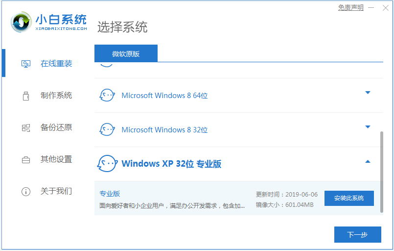 1、安裝好小白一鍵重裝系統工具并打開,選擇windows xp系統,點擊安裝此系統。