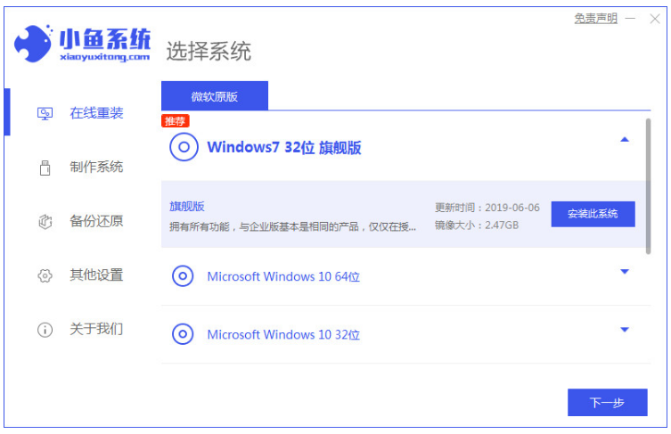 1、hp電腦怎么樣重裝系統呢?在電腦上搜索并下載安裝小魚一鍵重裝系統打開軟件,選擇windows7 32位 專業版系統,點擊安裝此系統。