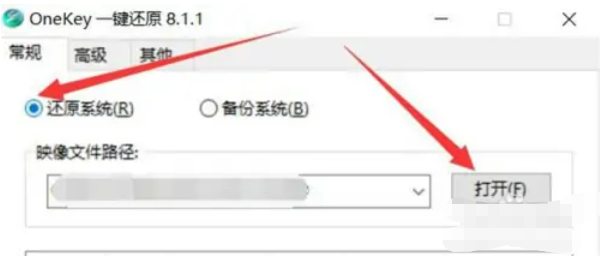 在“常規”版面當中,選中【還原系統】選項,單擊“映像文件路徑”板塊下的【打開】。