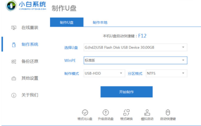 1、首先準備一個8G以上的空白U盤,將其插入電腦usb接口。下載安裝小白一鍵重裝系統工具到電腦上并打開軟件,點擊制作系統,在制作U盤下點擊開始制作即可。