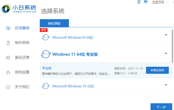 1、首先我們在電腦上下載安裝好小白一鍵重裝系統工具并打開,然后在線重裝界面選擇win11系統作為例子。
