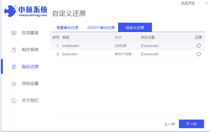 2、在備份還原界面選擇“自定義還原”,接著選擇我們需要安裝的win10系統鏡像進入下一步。