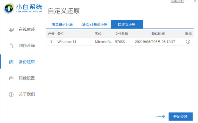 1、自行在網上下載好win11中文版系統鏡像。然后在電腦上下載安裝并打開小白一鍵重裝系統軟件,點擊備份還原。