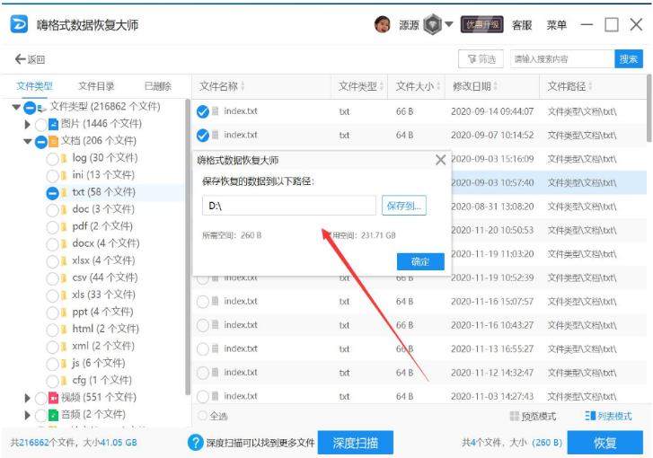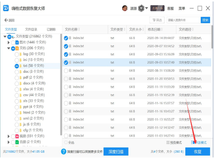 3、數據掃描完成后,選擇需要恢復的文件,點擊“恢復”。