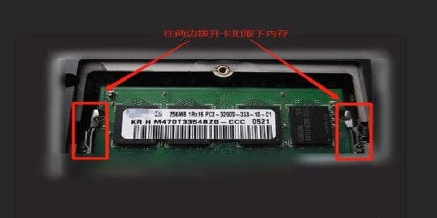 5、此時就可以看到里面的內存條了,用手撥開兩邊的卡扣,就可以將內存條拔下來了,如圖所示。