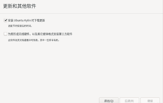 3.設置安裝時更新和其他軟件方式。如果已聯網,并勾選“安裝 Ubuntu Kylin 時下載更新”,系統安裝將花費更多時間,約需要1小時。