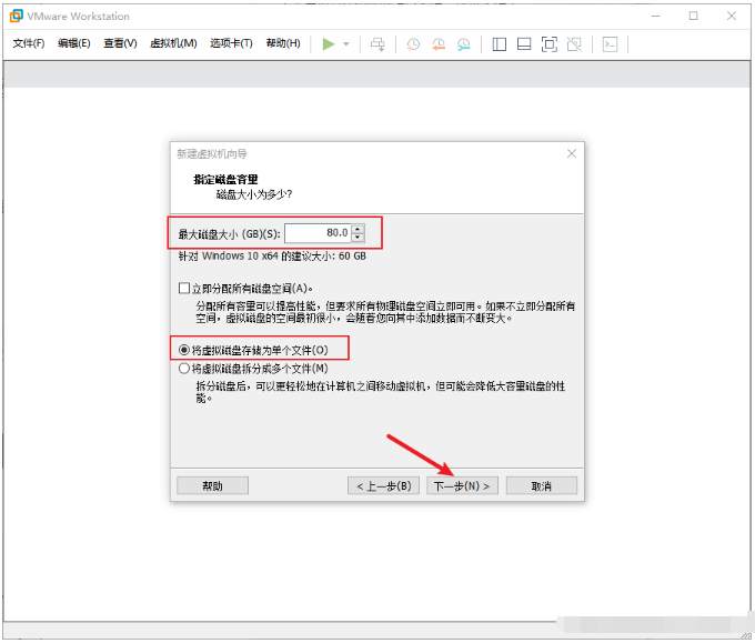10、創建一個新的虛擬磁盤,在向導界面分配磁盤空間,選擇單個文件初期方便管理。