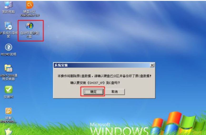 5、完成分區后,雙擊【自動恢復xp到C盤】,點擊提示框中的確定。