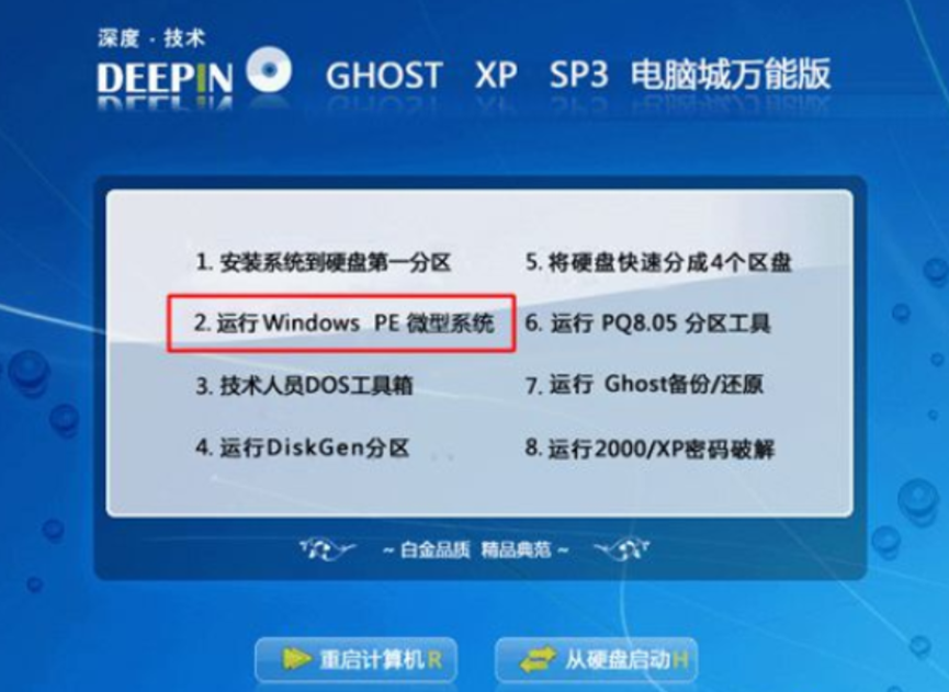 2、啟動進入xp光盤界面,選擇【2】回車或直接按下數字2。