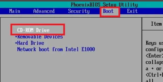 2、重啟電腦。按DEL鍵進入BIOS。用鍵盤上的上下左右鍵移動到BOOT,再按“+”鍵把CD-ROM移動到首選項。