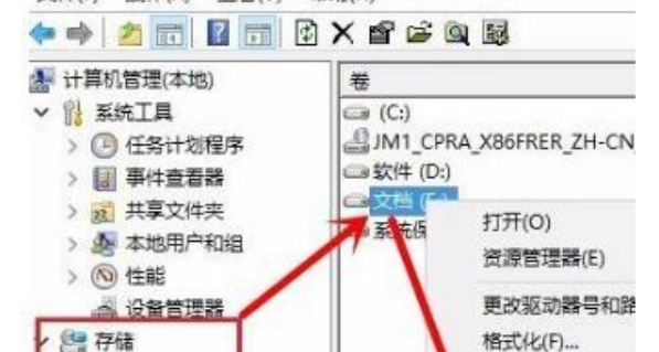 2、在管理界面點擊存儲的“磁盤管理”,找到無法格式化的電腦c盤磁盤,鼠標右擊選擇“刪除卷”。
