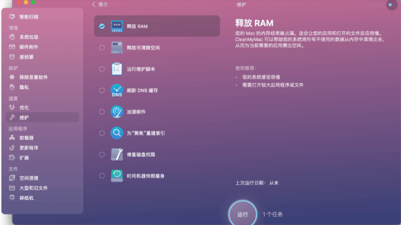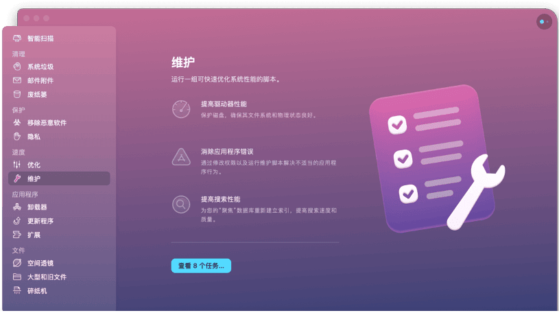 有一個只有開發者以及特別熟悉 Mac 的人才知道的技巧。那就是當我們的蘋果電腦運行速度慢時,有時候是因為系統需要底層優化。如果你對 Mac 系統并不熟悉,是電腦新手用戶也沒關系。只需要啟動 CleanMyMac X 運行維護腳本。即可迅速地重新整理系統庫、輪轉日志以及數據庫。讓 Mac 保持更加理想的運行狀態。這也是十分簡單、而且高效的 Mac 提速方式。