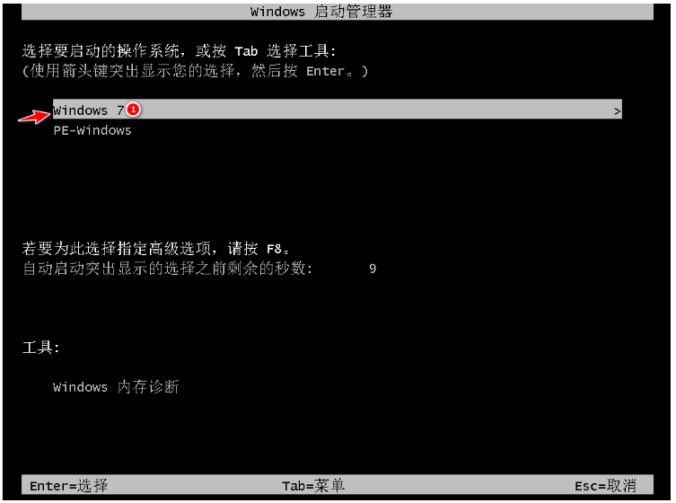 7、再次進入到啟動管理器界面,選擇windows7,按回車進入。