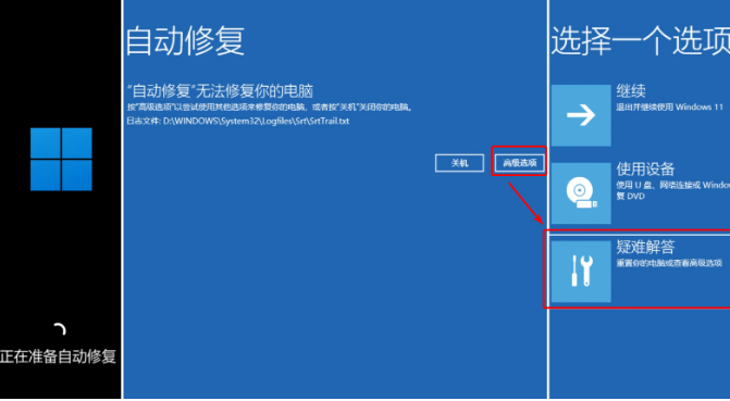 等待進入修復界面 - 查看高級選項 - 疑難解答。