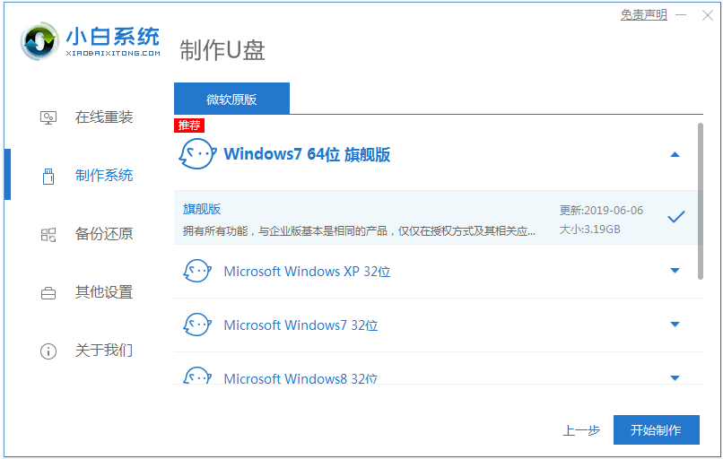 在制作系統欄目,選擇需要的windows系統,點擊開始制作u盤啟動盤。