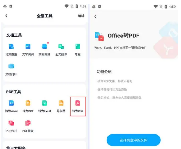 首先打開網盤工具,找到“全部工具”,往下滑動找到“PDF工具”,點擊“轉為PDF”,選擇你網盤中我們需要轉換的PPT就OK啦。