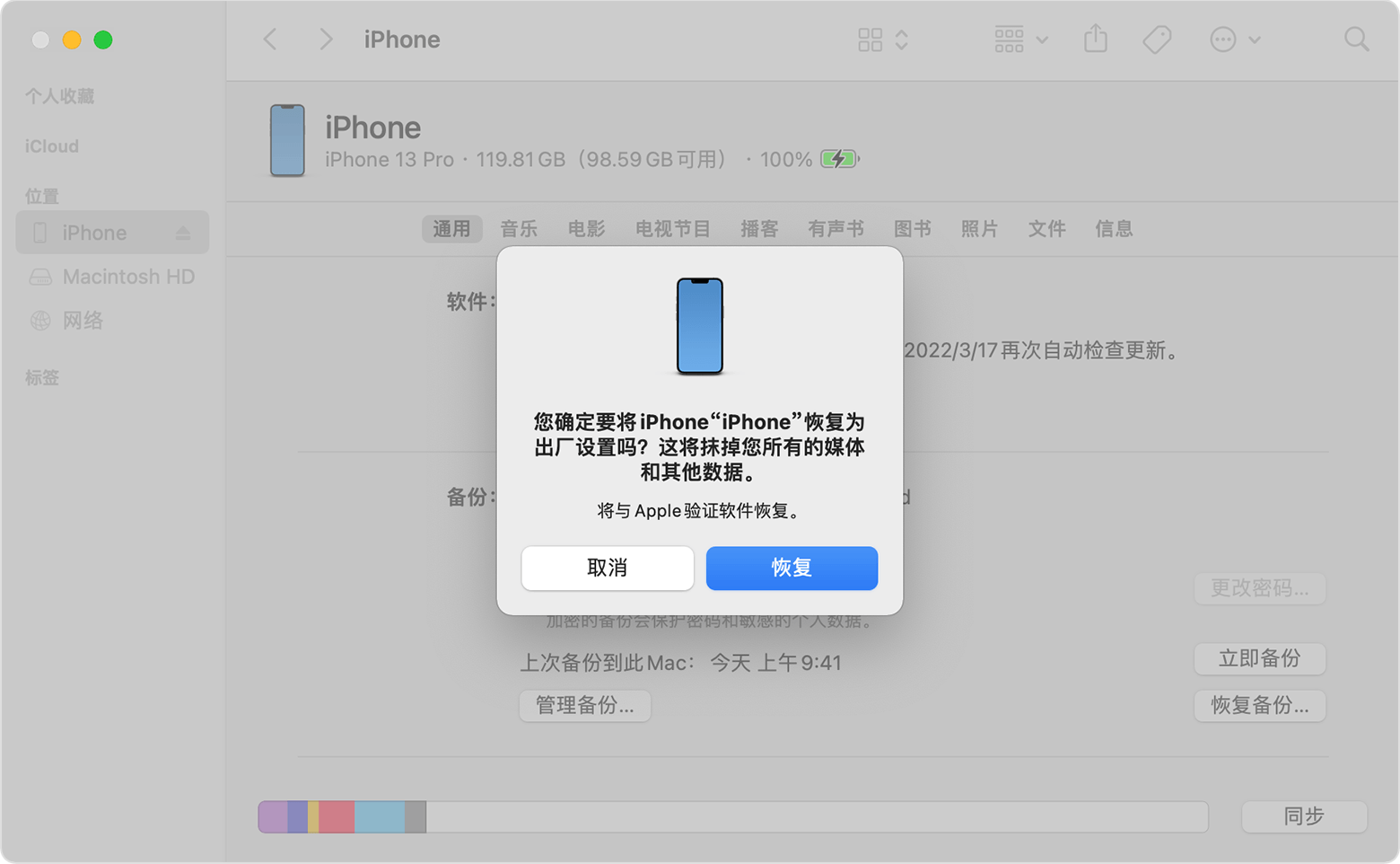 3、再次點按“恢復”以進行確認。你的電腦隨即會抹掉你設備中的內容并安裝最新的 iOS、iPadOS 或 iPod 軟件。