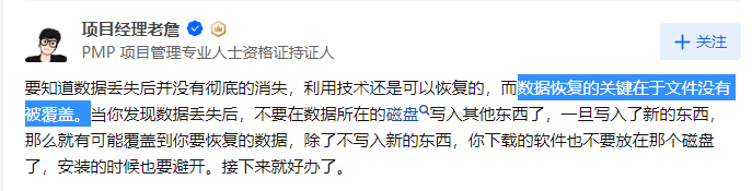 當出現硬盤數據丟失的情況時,重點是不要重復對硬盤進行寫入等操作,避免數據被覆蓋而無法恢復。正如知乎上的大牛老詹所言,數據恢復的關鍵在于文件沒有被覆蓋,不覆蓋的情況下,軟件是大概率可以找回數據的。