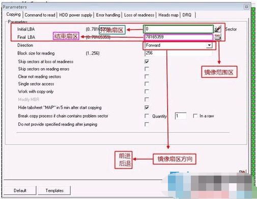 以上就是整個鏡像克隆過程了,但我們硬盤其實是有壞道的,不能直接完全的克隆,如果你之前用壞道掃描軟件知道哪些扇區是好的,哪些是壞的,那么可以直接先去設置一下,只克隆好的部分。如下圖這樣只克隆某個好的起始扇區和結束扇區再克隆鏡像,這樣能保證硬盤的壞道不會繼續擴散,好的克隆完成后再去克隆壞扇區部分,這樣能先把好扇區的文件全部恢復出來再去解決壞扇區的數據。