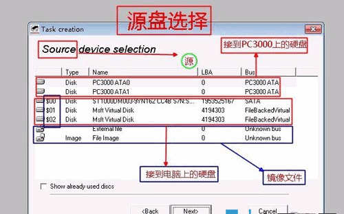 4、選擇源盤,就是壞的硬盤,它會列出所有的硬盤,包括自己的電腦上的和pc3000設備上的,根據圖示自行區分,注意看pc3000上ata1和ata2哪個是壞道硬盤就選那個。