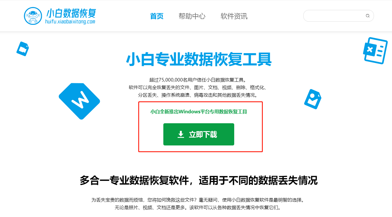 小白數據恢復是一款操作簡單、專業可靠的數據恢復軟件。小白數據恢復軟件可以幫助用戶處理誤刪除文件、誤格式化分區、誤分區、文件不能復制等問題,能夠對丟失的數據進行快速恢復。小白數據恢復軟件支持邊掃描邊顯示,方便用戶隨時找到需要恢復的文件。