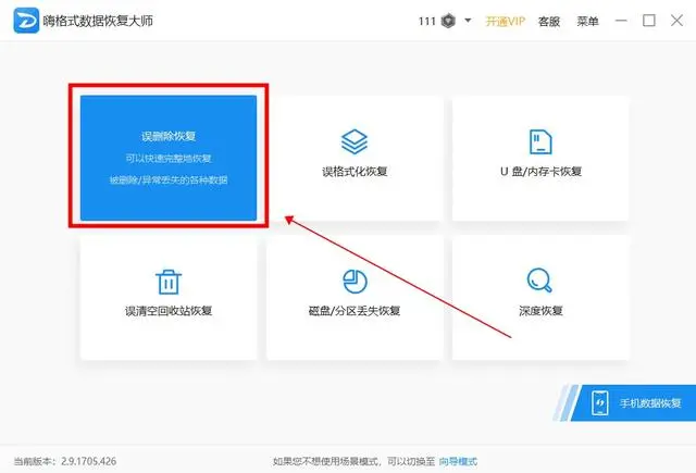 1、重裝系統后恢復原有文件方法,首先打開電腦中的【嗨格式數據恢復大師】,這個軟件共有六個恢復模式,點擊“誤刪除恢復”模式。