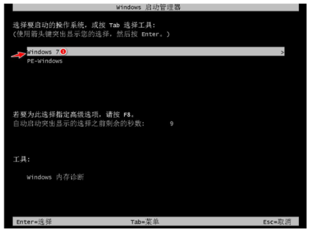 8、重啟之后在啟動菜單的界面當中,我們選擇windows7系統按回車鍵進入win7系統。