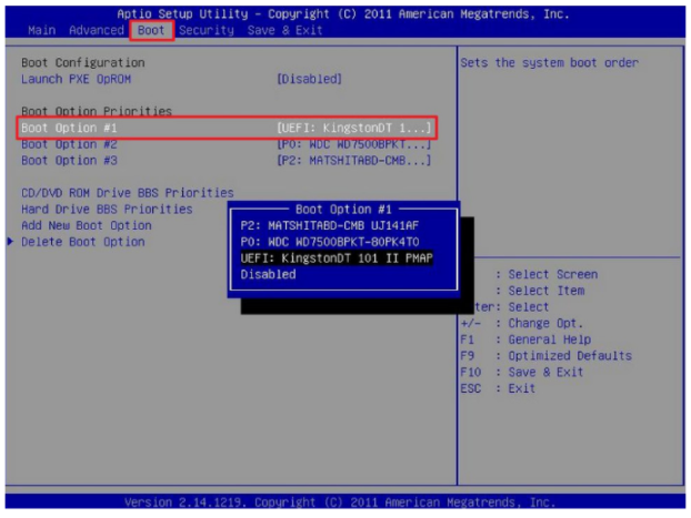 6、進入界面之后在Boot里選擇Boot Option #1,再選擇UEFI:KingstonDT 101 II PMAP。