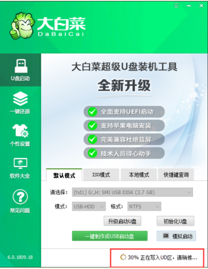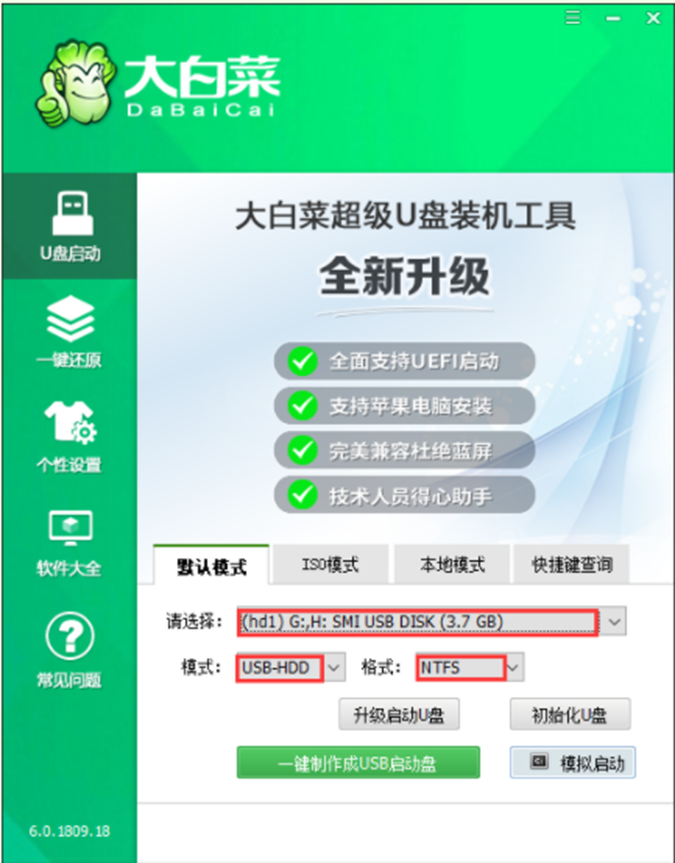 1、下載并安裝好大白菜裝機版,打開軟件并插入U盤,選擇“默認模式”,點擊需要制作啟動的設備,在模式選項中選擇“USB-HDD”,格式選擇“NTFS”。