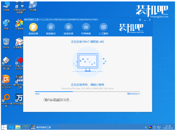 5、進入到pe系統之后,點擊打開裝機吧裝機工具,選擇需要安裝的win7系統,點擊安裝到系統盤c盤,點擊開始安裝。