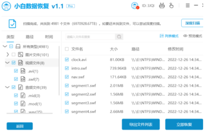 3、最后等待數據掃描完成后,選擇需要恢復的文件類型,點擊立即恢復,等待軟件對這些數據進行恢復即可。