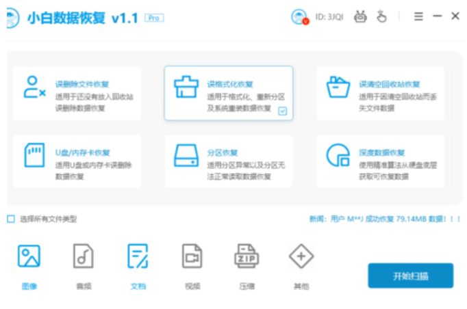 1、我們首先自行在電腦下載安裝小白數據恢復工具并打開,功能欄中選擇誤刪的文件是屬于哪種類型,點擊開始掃描。